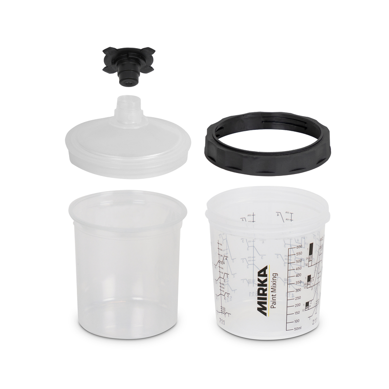 9190170180 – Set godets jetables 180 ml MIRKA PCS pour pistolet pneumatique comprenant : 1 godet externe rigide gradué + bague de serrage, 50 poches jetables, 50 couvercles / filtre 125 µ, 20 bouchons