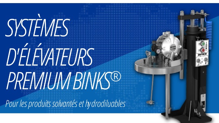 DE-05BB – Élévateur pneumatique BINKS Premium course 500 mm pour fût 25 litres avec commande monte et baisse côté droit et couvercle lisse.
