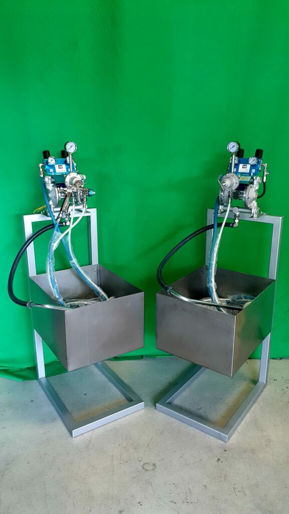 Ensembles de pulvérisation pneumatique avec pompe IWATA DPS90 et pistolet pression W-200 SP avec buses à ailettes sur châssis avec bacs de rétention conçus sur mesures avec notre client.